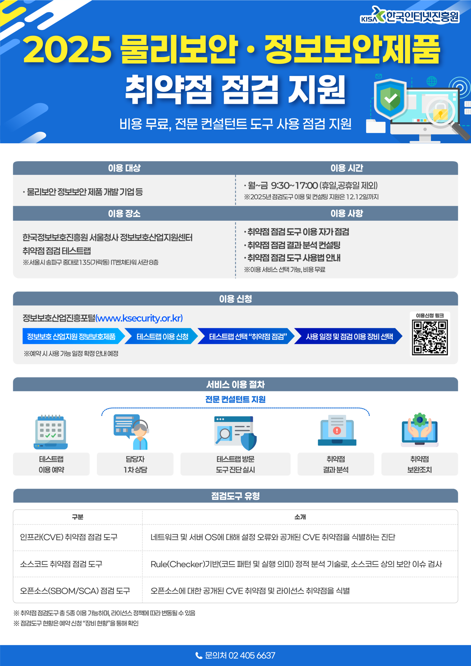 한국인터넷진흥원에서 주관하는 "물리보안·정보보안 제품 취약점 점검 지원" 사업을 안내드립니다.